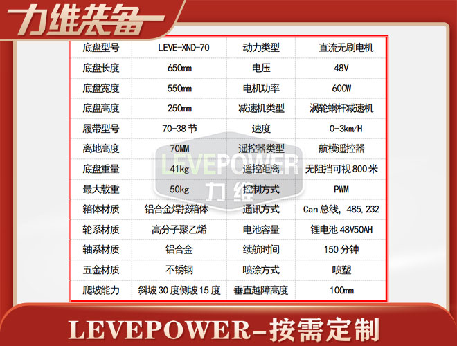 履帶底盤長650mm,履帶底盤寬550mm,履帶底盤高250mm,無線遙控履帶底盤通訊方式:Can總線,485,232.箱體采用鋁合金材質焊接而成,防腐性能好。履帶底盤動力采用48V600W直流無刷電機,渦輪蝸桿減速機動力更強,轉彎靈活。履帶底盤電池采用48V50AH鋰電池,續(xù)航時間更長,是一款不錯的機器人橡膠履帶。