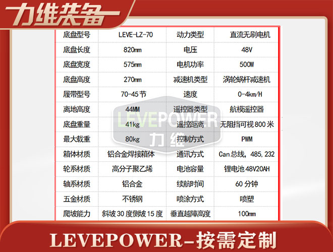 履帶底盤長820mm,履帶底盤寬575mm,履帶底盤高270mm,無線遙控履帶底盤箱體采用鋁合金材質(zhì)焊接而成,防腐性能好。履帶底盤動力采用48V500W直流無刷電機,渦輪蝸桿減速機動力更強,轉(zhuǎn)彎靈活。履帶底盤電池采用48V20AH鋰電池,續(xù)航時間更長,是一款不錯的機器人橡膠履帶。