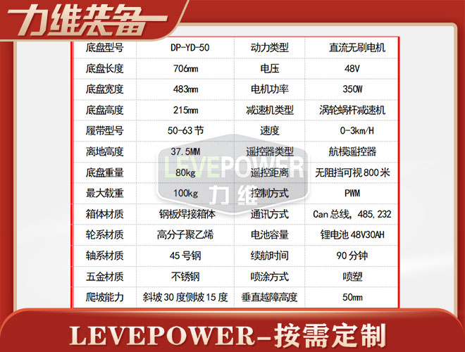 橡膠履帶底盤長(zhǎng)706mm,橡膠履帶底盤寬483mm,橡膠履帶底盤高215mm,無(wú)線航模遙控履帶底盤采用48v350W直流無(wú)刷永磁電機(jī),渦輪蝸桿減速機(jī)動(dòng)力更強(qiáng),轉(zhuǎn)彎靈活,操控簡(jiǎn)單。履帶底盤電池采用48V30AH鋰電池續(xù)航時(shí)間更長(zhǎng)。履帶底盤箱體采用鋼板焊接而成,輪系采用高分子聚乙烯,履帶底盤整體重量輕,耐磨性強(qiáng)。