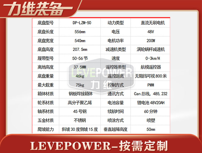 橡膠履帶底盤長556mm,橡膠履帶底盤寬540mm,橡膠履帶底盤高207.5mm,無線遙控履帶底盤采用48v200W直流無刷永磁電機(jī),渦輪蝸桿減速機(jī)動(dòng)力更強(qiáng),轉(zhuǎn)彎靈活,操控簡單。履帶底盤電池采用48V20AH鋰電池續(xù)航時(shí)間更長。履帶底盤箱體采用鋼板焊接而成,輪系采用高分子聚乙烯,履帶底盤整體重量輕,耐磨性強(qiáng)。